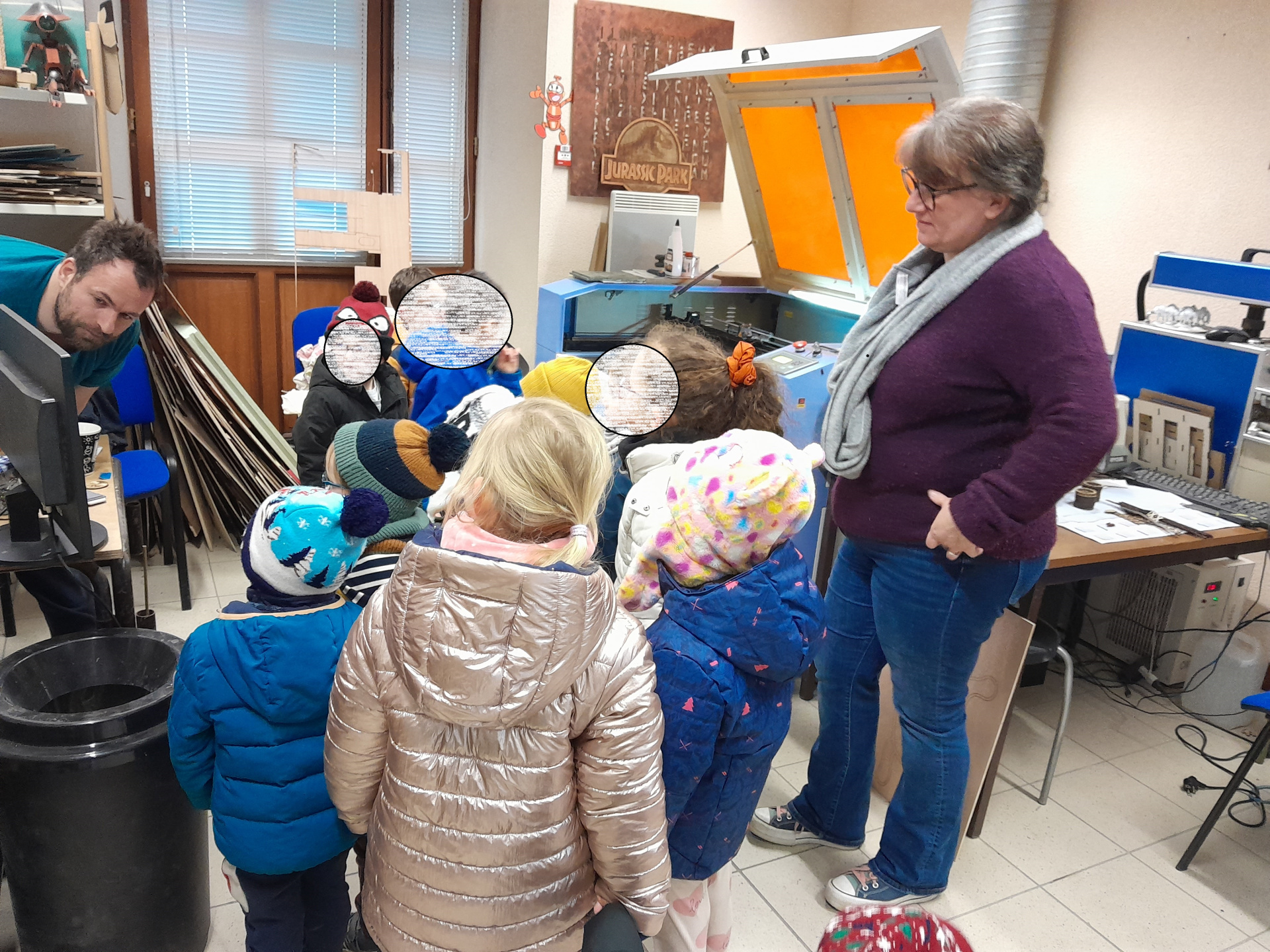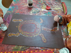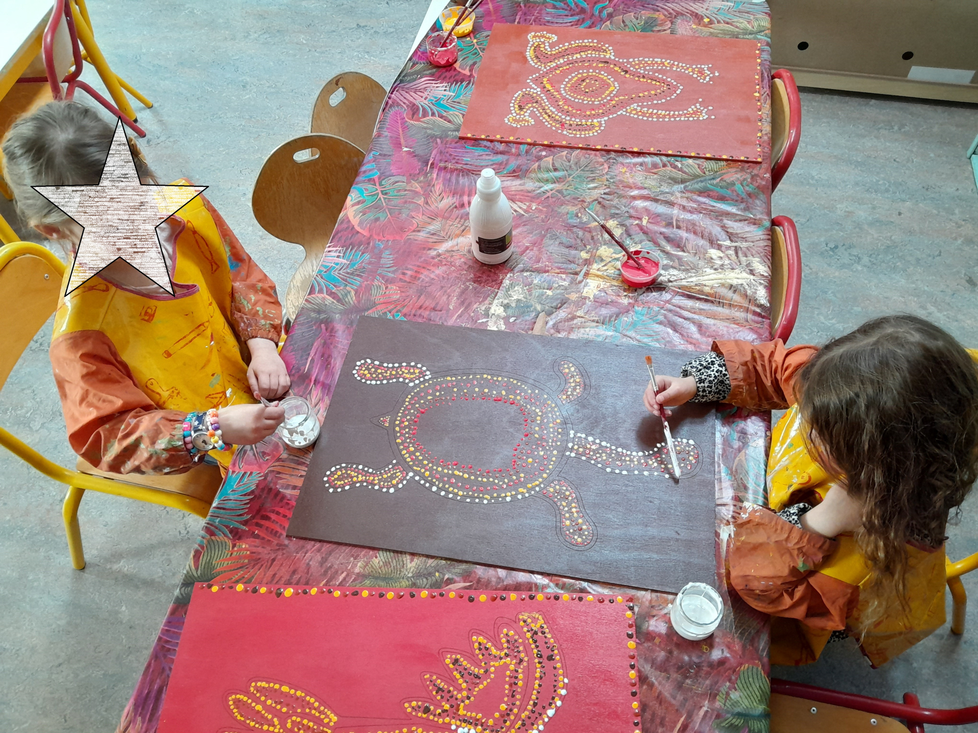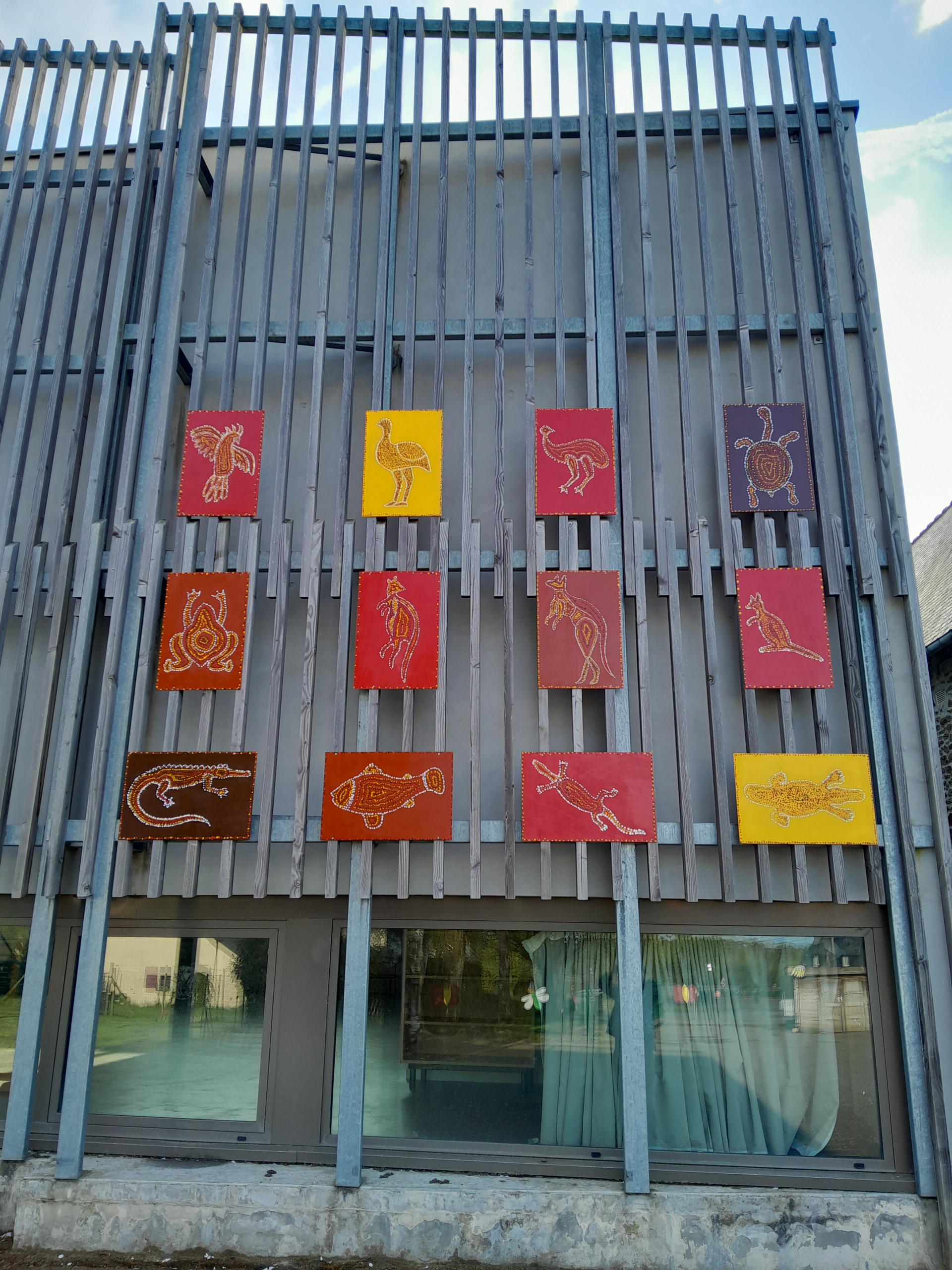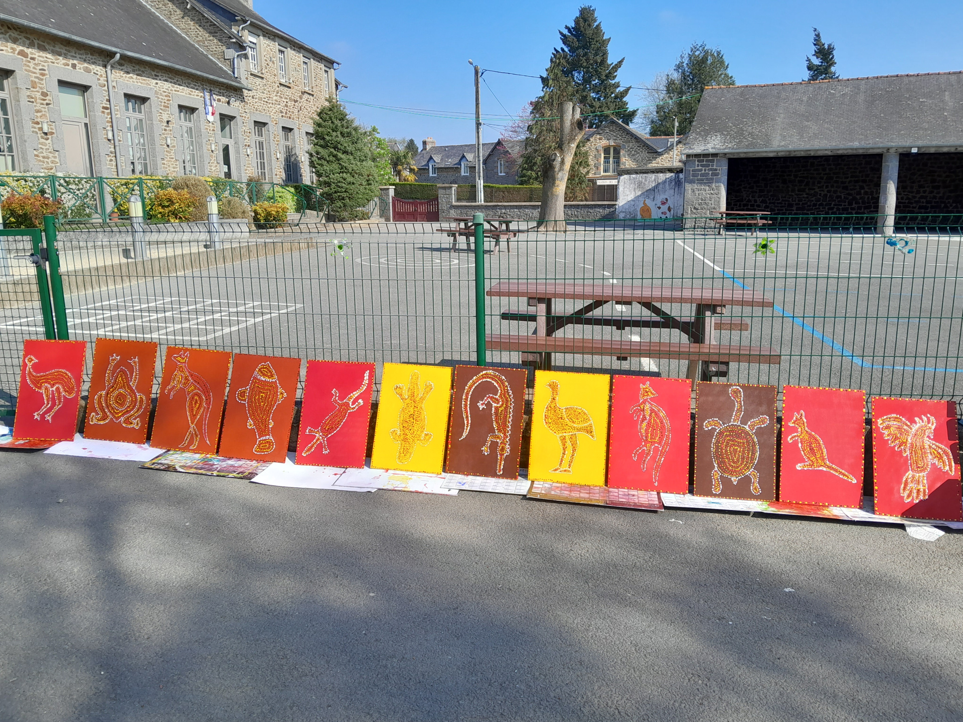 Les élèves de PS-GS de la classe de Mélanie et Audrey ont découvert l’Espace Public Numérique de Mesnil Roc’h. Bertrand leur a montré comment fonctionnait l’imprimante laser. Les élèves, très attentifs, ont observé l’imprimante en train de graver les silhouettes d’animaux d’Australie sur de grandes planches de bois. Au total 12 planches ont été gravées. Du cacatoès au kangourou, en passant par l’émeu ou la tortue…les élèves sont devenus des spécialistes des animaux d’Australie ! De retour en classe, les enfants ont recouvert les planches de bois de peintures de couleurs naturelles : jaune, marron ou rouge. Ensuite, durant plusieurs semaines, de février à avril, les élèves ont rempli les silhouettes d’animaux de petits points, comme le faisaient autrefois les aborigènes d’Australie. Elise Fougeyrollas, intervenante en arts plastiques dans les écoles de Mesnil Roc’h a montré aux enfants différentes œuvres aborigènes. Elle leur a aussi expliqué comment bien tenir les pinceaux pour éviter les coulures. Avec patience et minutie, les élèves ont crée 12 œuvres uniques, qu’ils sont aujourd’hui très fiers d’exposer dans leur cour de récréation !