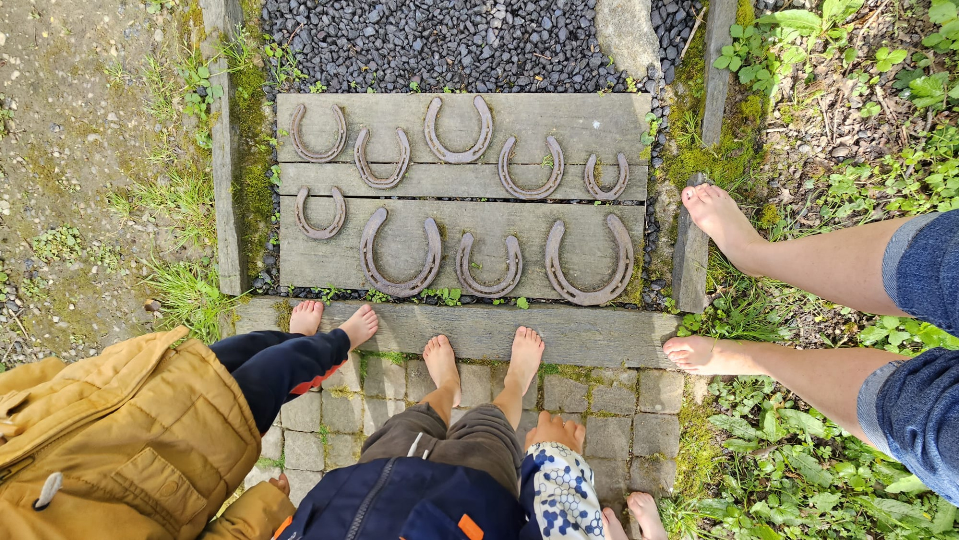 La matinée a débuté par le parcours « Réveille tes pieds ». Les enfants ont découvert différentes sensations sous leurs pieds. Ils ont marché sur des galets, des petits cailloux, des copeaux, de la boue, de l’eau… avec grand plaisir. Ils ont aussi observé des empreintes d’animaux et se sont même aventurés dans un labyrinthe ! Que d’aventures !